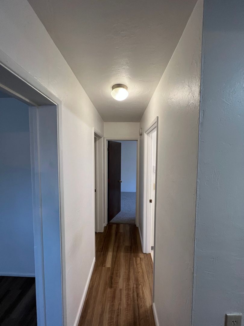 2 bedroom, 1 bathroom duplex on raised corner lot. Great location near parks, schools, and easy walk, bus and bike routes to campus, shopping and other amenities. Laminate plank flooring in living areas and carpet in bedrooms. Features a covered front porch and fenced back yard with extra storage. Off street parking, Yard care provided. Washer & Dryer may be on site but are considered 'As Is'.