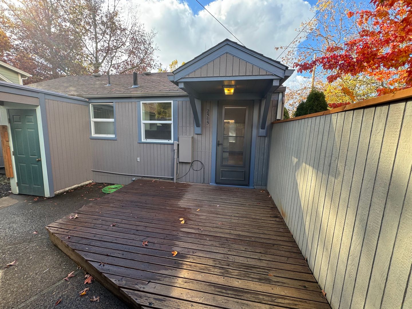 Charming 2 bedroom, 1 bathroom house on shared lot in prime SE Eugene location near parks, schools, bus lines, shopping and more. Easy access to UO. Spacious bedrooms. Large front yard with nice curb appeal and established landscaping, with yard care included. Fenced back deck and large detached storage built -ins which house washer/dryer hookups--current units provided, but not maintained. Driveway off 25th not included [goes to back unit].